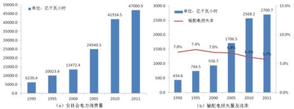 自改革開放以來,我國城鎮化水平快速提升,2013年我國城鎮化率為53.73%,但與發達國家相比還處于較低水平。2013年中央城鎮化工作會議指出,城鎮化與工業化一道,是現代化的兩大引擎。但近年來我國經濟社會發展面臨著越來越嚴峻的資源環境約束,圖1是根據國家統計局數據繪制的我國全社會電力消費量和損耗變化情況,隨著城鎮化的推進,未來人們對電力的需求將持續增加。